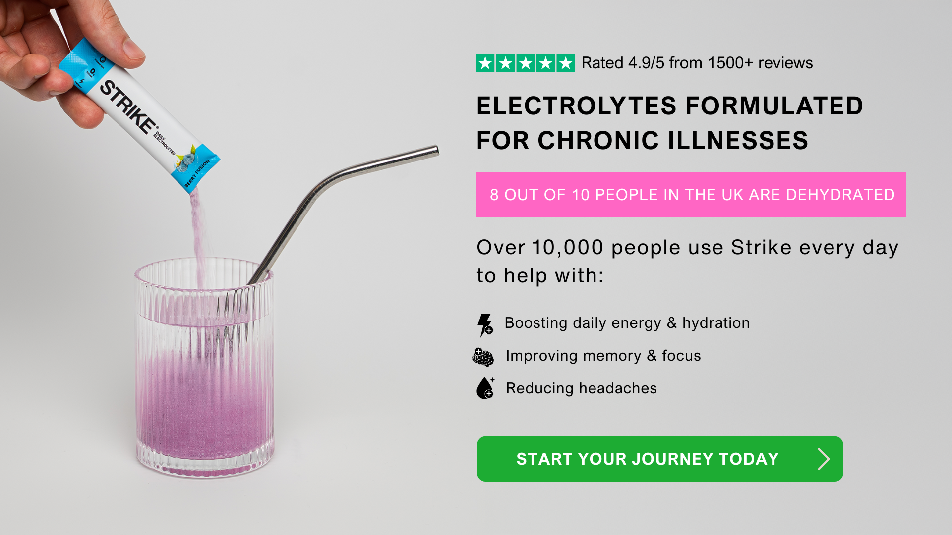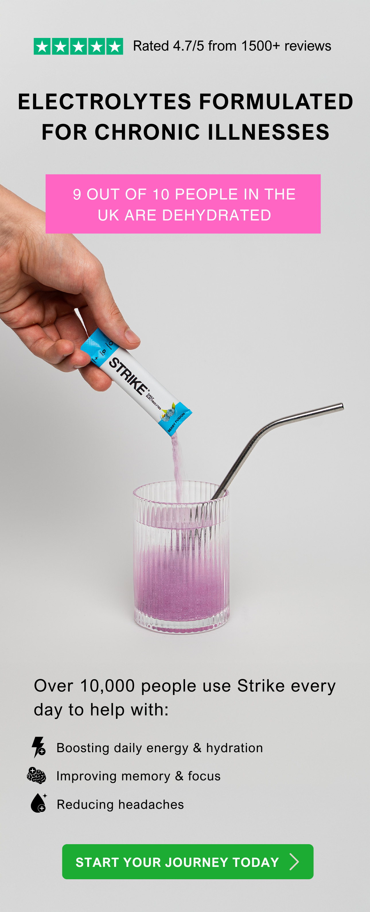 Did you know that 90% of people in the UK are dehydrated? Strike Electrolytes will fill this gap, so you can enjoy more energy throughout the day!